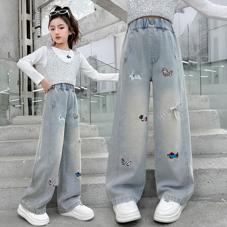 蓝*7下载视频“2509a款小狗刺绣阔腿裤”